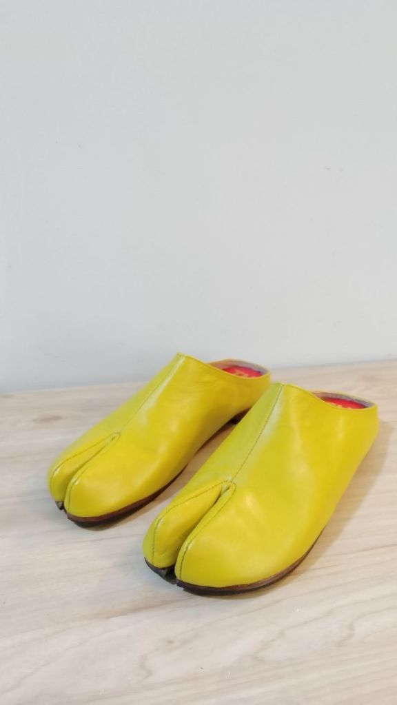 Handmade Japanese Tabi mules with split toe design,completely hand stitched from top to bottom. The mules are made with soft goat leather , very comfortable with leather uppers and soles