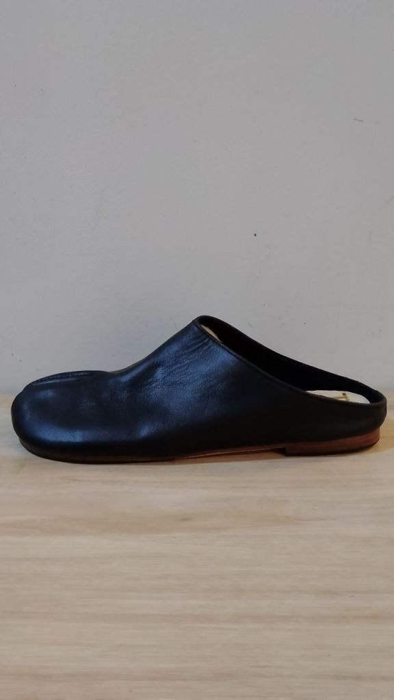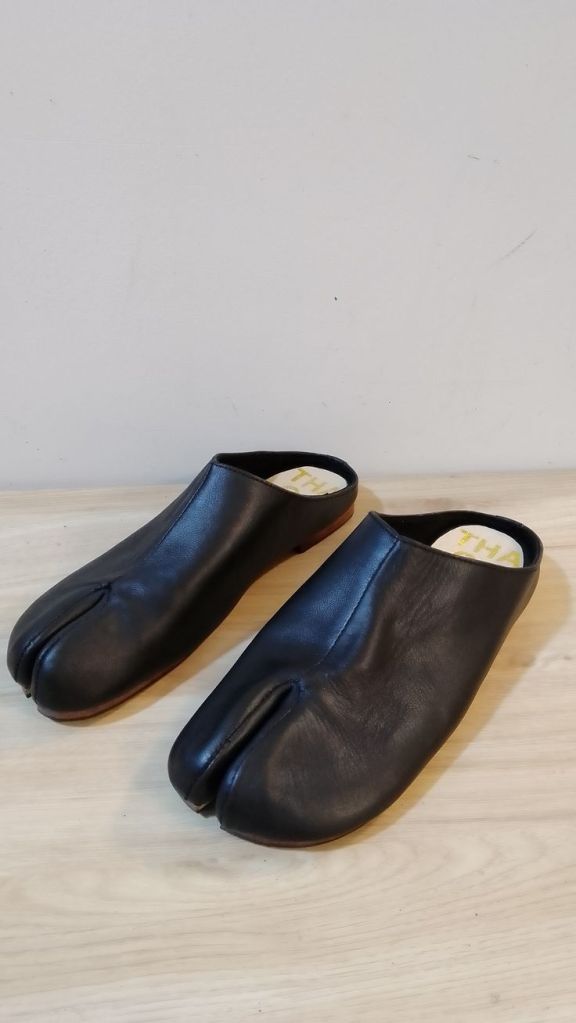 Handmade Japanese Tabi mules with split toe design,completely hand stitched from top to bottom. The mules are made with soft goat leather , very comfortable with leather uppers and soles