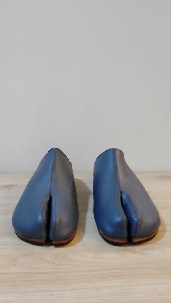 Handmade Japanese Tabi mules with split toe design,completely hand stitched from top to bottom. The mules are made with soft goat leather , very comfortable with leather uppers and soles