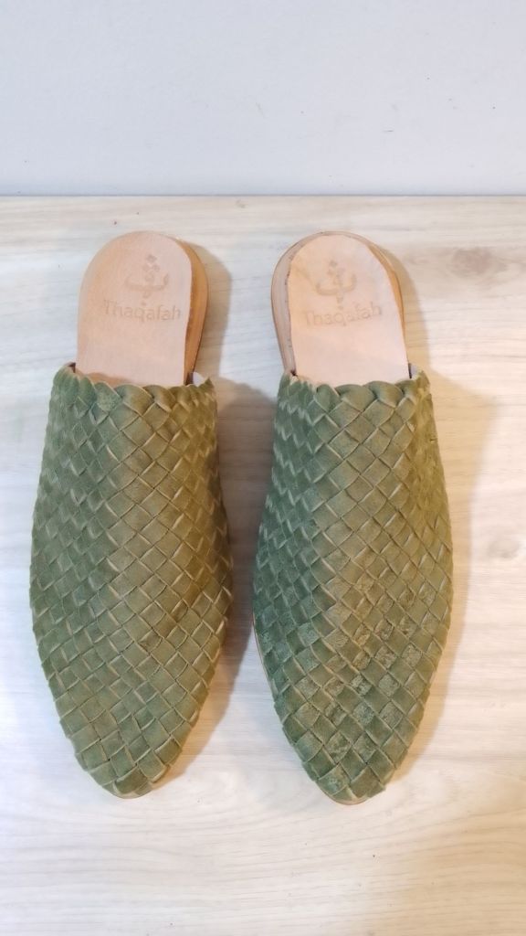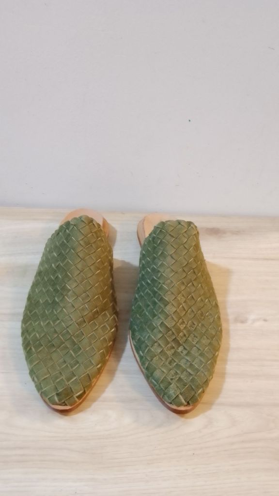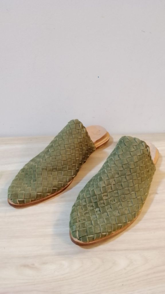 Moroccan babouche inspired woven mules with classic pointed toe and accented almond heel design. Completely hand stitched from top to bottom. The mules fit like a glove and are made with soft supple suede leather.