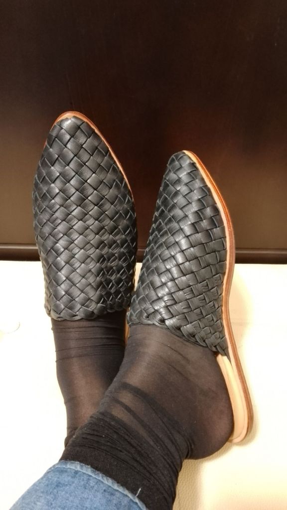 Moroccan babouche inspired woven mules with classic pointed toe and accented almond heel design. Completely hand stitched from top to bottom. The mules fit like a glove and are made with soft supple calf leather.