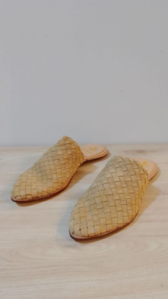 Moroccan babouche inspired woven mules with classic pointed toe and accented almond heel design. Completely hand stitched from top to bottom. The mules fit like a glove and are made with soft supple suede leather.
