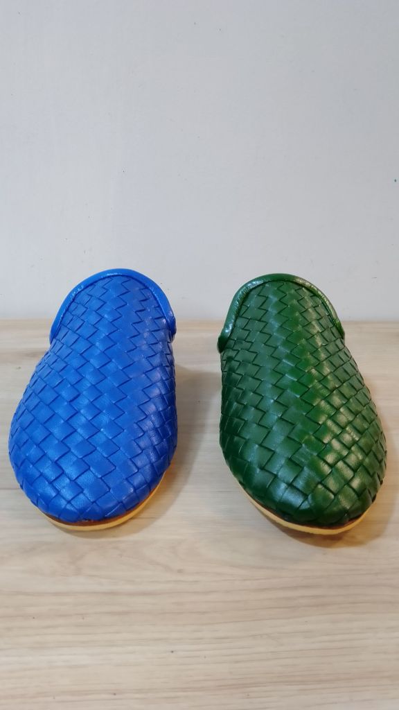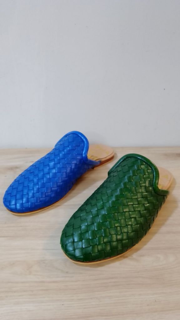 Moroccan babouche inspired woven mules with classic round toe with accented piping finishing design. Completely hand stitched from top to bottom. The mules fit like a glove and are made with soft supple leather.