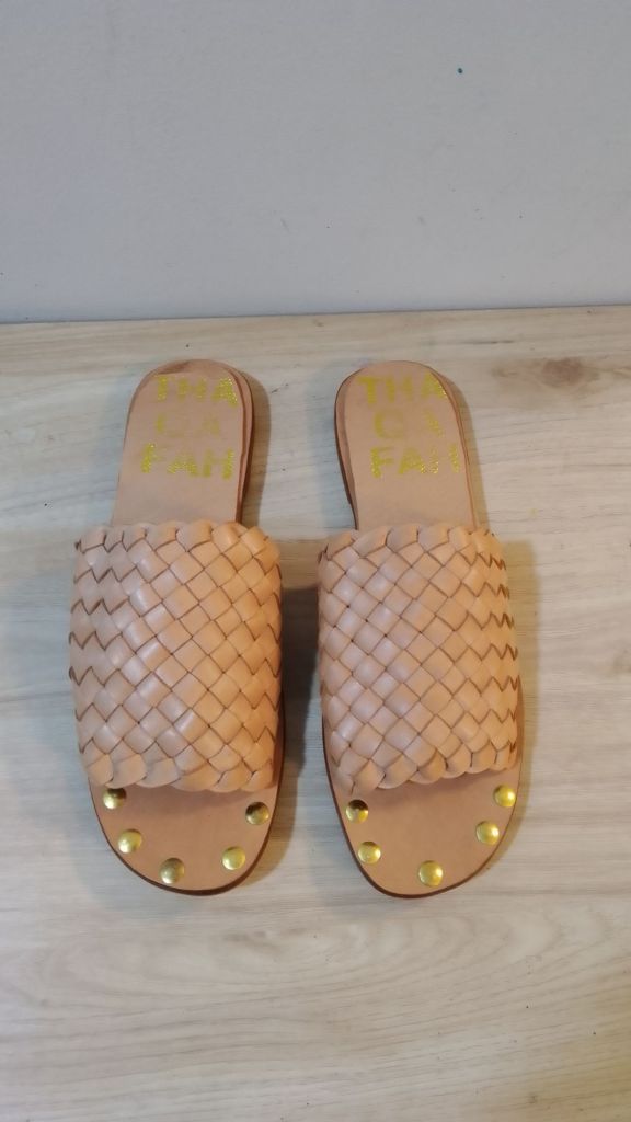 Gold stud toe handmade woven slide sandals . These leather sandals are completely handstitched from top to bottom. The sandals are made from pure cowhide leather and are very comfortable with gold studs at the toe for added design.