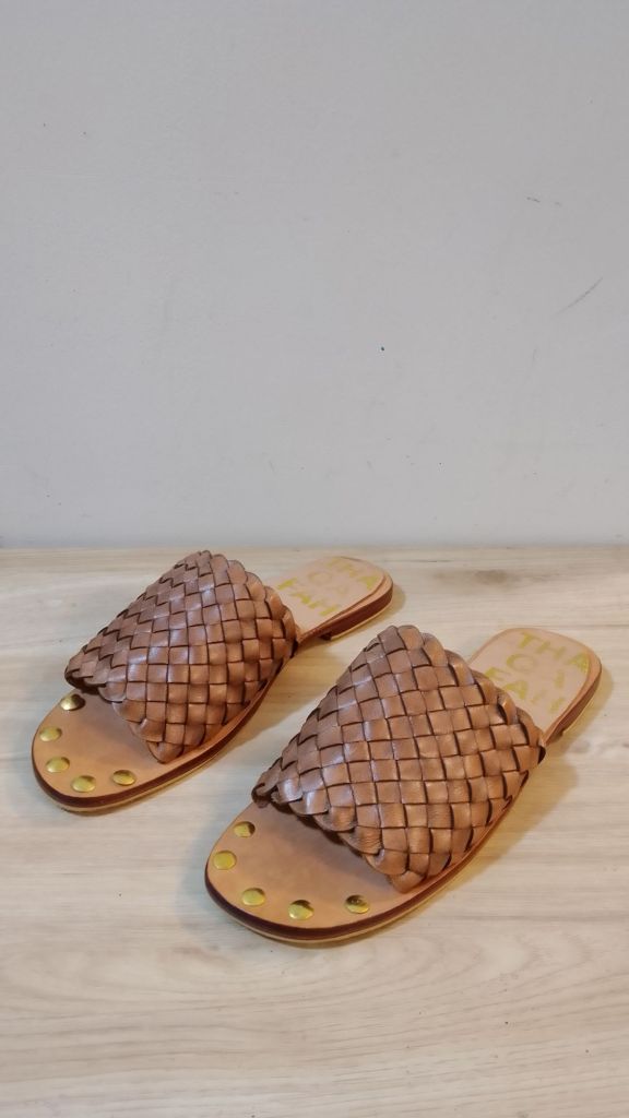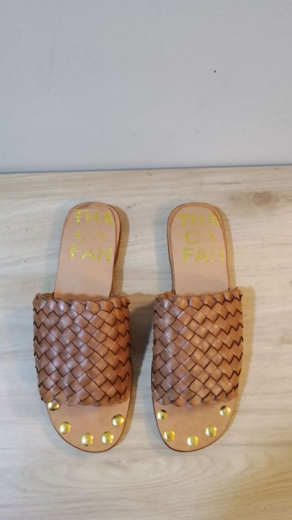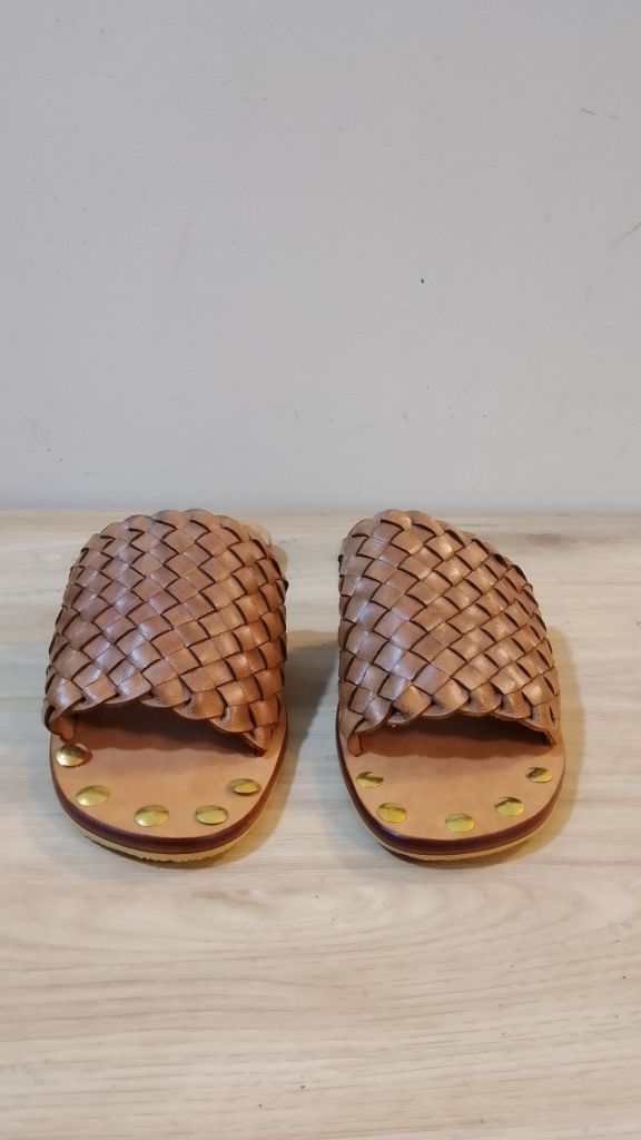 Gold stud toe handmade woven slide sandals . These leather sandals are completely handstitched from top to bottom. The sandals are made from pure cowhide leather and are very comfortable with gold studs at the toe for added design.