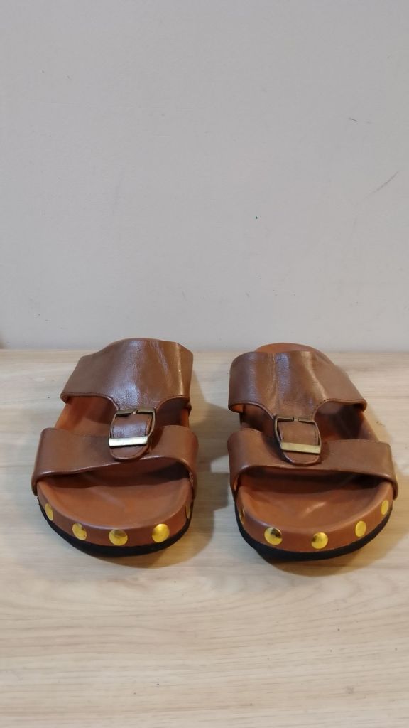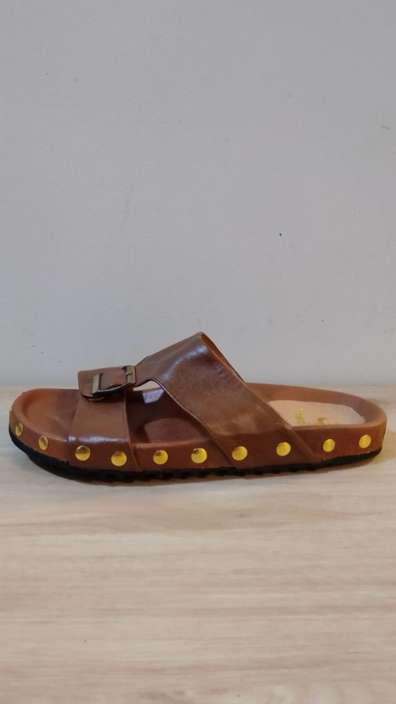 Emirati inspired Arabic sandals, with upper buckle strap design , berkinstock footbed, studded outsoles for a unique design. Handstitched from top to bottom, made from pure goat leather , soft cushion footbed rubber tread soles and very comfortable to wear.