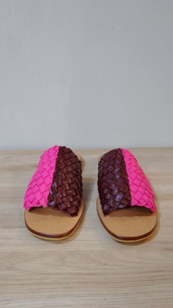 Two tone handmade woven slide sandals . These leather sandals are completely handstitched from top to bottom. The sandals are made from pure goat leather and are very comfortable with custom colour block design.