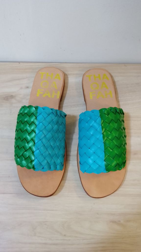 Two tone handmade woven slide sandals . These leather sandals are completely handstitched from top to bottom. The sandals are made from pure goat leather and are very comfortable with custom colour block design.