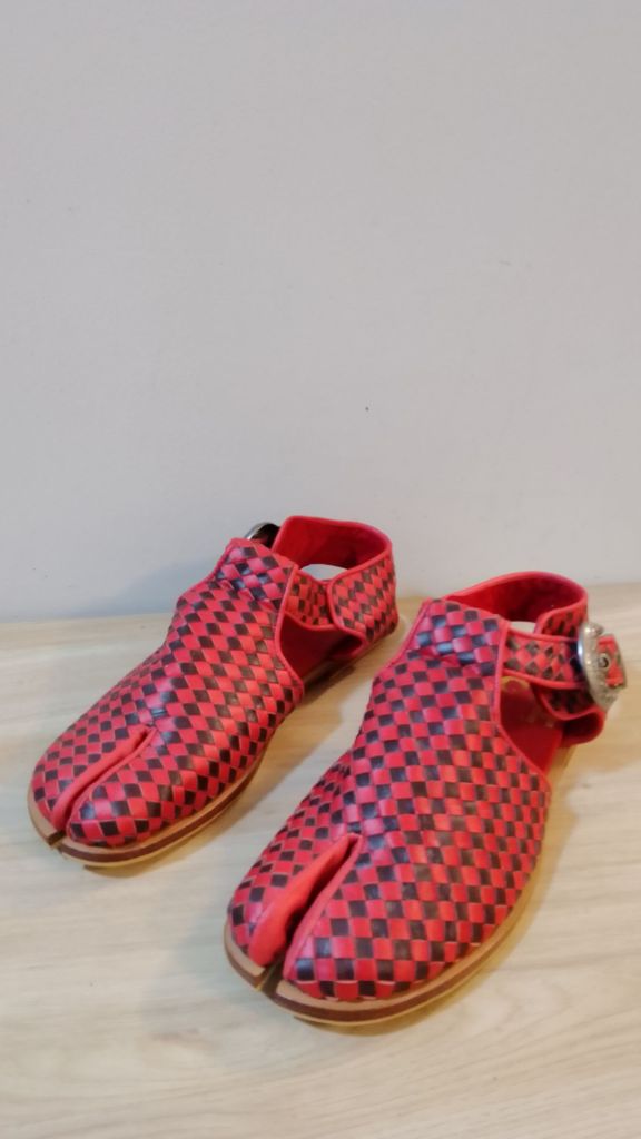Fisherman inspired sandals, with traditional Japanese Tabi design. Handmade woven color leather sandals, complete with a funky western buckle to compliment the design. Goat leather uppers and insoles with rubber soling